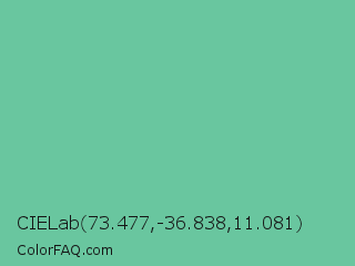 CIELab 73.477,-36.838,11.081 Color is a normal green color and the nearest color is Silver Tree #66b58f. Hex code #69c69f and RGB value is rgb(105,198,159). In RGB color space, this color is composed of 41% red, 78% green, 62% blue, In CMYK color space, this color is composed of 47% cyan, 0% magenta, 20% yellow , 22% black , In HSL color space, this color has a hue angle of 155° , 45% saturation and 59% lightness.