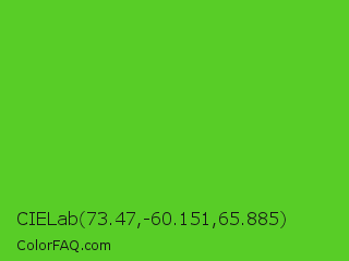 CIELab 73.47,-60.151,65.885 Color is a normal green color and the nearest color is Harlequin Green #46cb18. Hex code #58cd27 and RGB value is rgb(88,205,39). In RGB color space, this color is composed of 35% red, 80% green, 15% blue, In CMYK color space, this color is composed of 57% cyan, 0% magenta, 81% yellow , 20% black , In HSL color space, this color has a hue angle of 102° , 68% saturation and 48% lightness.