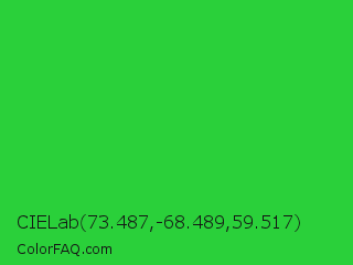 CIELab 73.487,-68.489,59.517 Color is a normal green color and the nearest color is Lime Green #32cd32. Hex code #2ad03a and RGB value is rgb(42,208,58). In RGB color space, this color is composed of 16% red, 82% green, 23% blue, In CMYK color space, this color is composed of 80% cyan, 0% magenta, 72% yellow , 18% black , In HSL color space, this color has a hue angle of 126° , 66% saturation and 49% lightness.