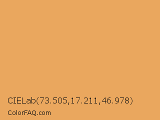 CIELab 73.505,17.211,46.978 Color is a light orange color and the nearest color is Earth Yellow #e1a95f. Hex code #eaa75e and RGB value is rgb(234,167,94). In RGB color space, this color is composed of 92% red, 65% green, 37% blue, In CMYK color space, this color is composed of 0% cyan, 29% magenta, 60% yellow , 8% black , In HSL color space, this color has a hue angle of 31° , 77% saturation and 64% lightness.