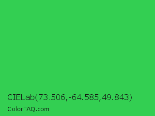 CIELab 73.506,-64.585,49.843 Color is a normal green color and the nearest color is UFO Green #3cd070. Hex code #33cf52 and RGB value is rgb(51,207,82). In RGB color space, this color is composed of 20% red, 81% green, 32% blue, In CMYK color space, this color is composed of 75% cyan, 0% magenta, 60% yellow , 19% black , In HSL color space, this color has a hue angle of 132° , 62% saturation and 51% lightness.