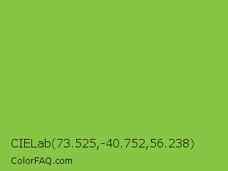 CIELab 73.525,-40.752,56.238 Color is a normal green color and the nearest color is Yellow Green #9acd32. Hex code #87c645 and RGB value is rgb(135,198,69). In RGB color space, this color is composed of 53% red, 78% green, 27% blue, In CMYK color space, this color is composed of 32% cyan, 0% magenta, 65% yellow , 22% black , In HSL color space, this color has a hue angle of 89° , 53% saturation and 52% lightness.