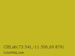 CIELab 73.541,-11.506,69.879 Color is a normal yellow color and the nearest color is Key Lime Pie #bfc921. Hex code #c3b821 and RGB value is rgb(195,184,33). In RGB color space, this color is composed of 76% red, 72% green, 13% blue, In CMYK color space, this color is composed of 0% cyan, 6% magenta, 83% yellow , 24% black , In HSL color space, this color has a hue angle of 56° , 71% saturation and 45% lightness.
