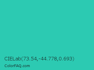 CIELab 73.54,-44.778,0.693 Color is a normal cyan color and the nearest color is Maximum Blue Green #30bfbf. Hex code #2ccab2 and RGB value is rgb(44,202,178). In RGB color space, this color is composed of 17% red, 79% green, 70% blue, In CMYK color space, this color is composed of 78% cyan, 0% magenta, 12% yellow , 21% black , In HSL color space, this color has a hue angle of 171° , 64% saturation and 48% lightness.