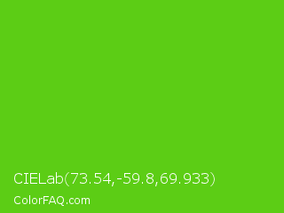 CIELab 73.54,-59.8,69.933 Color is a normal green color and the nearest color is Harlequin Green #46cb18. Hex code #5ccd15 and RGB value is rgb(92,205,21). In RGB color space, this color is composed of 36% red, 80% green, 8% blue, In CMYK color space, this color is composed of 55% cyan, 0% magenta, 90% yellow , 20% black , In HSL color space, this color has a hue angle of 97° , 81% saturation and 44% lightness.