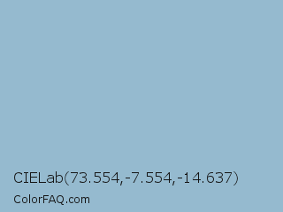 CIELab 73.554,-7.554,-14.637 Color is a light blue color and the nearest color is Dark Sky Blue #8cbed6. Hex code #95bacf and RGB value is rgb(149,186,207). In RGB color space, this color is composed of 58% red, 73% green, 81% blue, In CMYK color space, this color is composed of 28% cyan, 10% magenta, 0% yellow , 19% black , In HSL color space, this color has a hue angle of 202° , 38% saturation and 70% lightness.