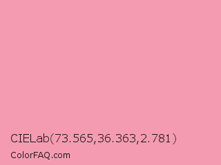 CIELab 73.565,36.363,2.781 Color is a light red color and the nearest color is Wewak #f19bab. Hex code #f59bb1 and RGB value is rgb(245,155,177). In RGB color space, this color is composed of 96% red, 61% green, 69% blue, In CMYK color space, this color is composed of 0% cyan, 37% magenta, 28% yellow , 4% black , In HSL color space, this color has a hue angle of 345° , 82% saturation and 78% lightness.