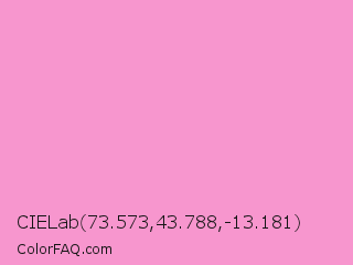 CIELab 73.573,43.788,-13.181 Color is a light magenta color and the nearest color is Pale Magenta Pink #ff99cc. Hex code #f796ce and RGB value is rgb(247,150,206). In RGB color space, this color is composed of 97% red, 59% green, 81% blue, In CMYK color space, this color is composed of 0% cyan, 39% magenta, 17% yellow , 3% black , In HSL color space, this color has a hue angle of 325° , 86% saturation and 78% lightness.