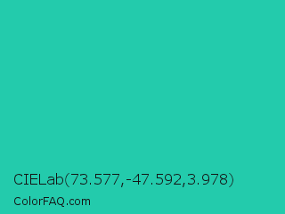 CIELab 73.577,-47.592,3.978 Color is a normal cyan color and the nearest color is Java #1fc2c2. Hex code #23cbac and RGB value is rgb(35,203,172). In RGB color space, this color is composed of 14% red, 80% green, 67% blue, In CMYK color space, this color is composed of 83% cyan, 0% magenta, 15% yellow , 20% black , In HSL color space, this color has a hue angle of 169° , 71% saturation and 47% lightness.