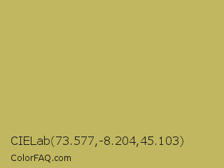 CIELab 73.577,-8.204,45.103 Color is a normal yellow color and the nearest color is Vegas Gold #c5b358. Hex code #c1b760 and RGB value is rgb(193,183,96). In RGB color space, this color is composed of 76% red, 72% green, 38% blue, In CMYK color space, this color is composed of 0% cyan, 5% magenta, 50% yellow , 24% black , In HSL color space, this color has a hue angle of 54° , 44% saturation and 57% lightness.
