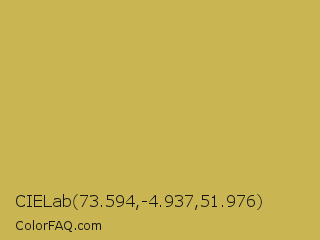 CIELab 73.594,-4.937,51.976 Color is a normal yellow color and the nearest color is Vegas Gold #c5b358. Hex code #c9b552 and RGB value is rgb(201,181,82). In RGB color space, this color is composed of 79% red, 71% green, 32% blue, In CMYK color space, this color is composed of 0% cyan, 10% magenta, 59% yellow , 21% black , In HSL color space, this color has a hue angle of 50° , 52% saturation and 55% lightness.