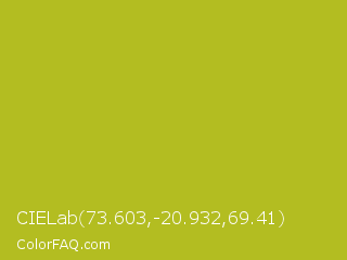 CIELab 73.603,-20.932,69.41 Color is a normal yellow color and the nearest color is Acid Green #b0bf1a. Hex code #b3bd21 and RGB value is rgb(179,189,33). In RGB color space, this color is composed of 70% red, 74% green, 13% blue, In CMYK color space, this color is composed of 5% cyan, 0% magenta, 83% yellow , 26% black , In HSL color space, this color has a hue angle of 64° , 70% saturation and 44% lightness.