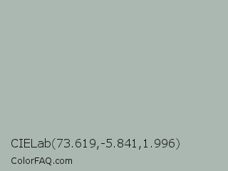 CIELab 73.619,-5.841,1.996 Color is a light green color and the nearest color is Ash Gray #b2beb5. Hex code #abb8b1 and RGB value is rgb(171,184,177). In RGB color space, this color is composed of 67% red, 72% green, 69% blue, In CMYK color space, this color is composed of 7% cyan, 0% magenta, 4% yellow , 28% black , In HSL color space, this color has a hue angle of 148° , 8% saturation and 70% lightness.