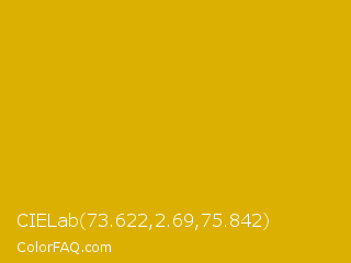 CIELab 73.622,2.69,75.842 Color is a normal yellow color and the nearest color is Galliano #dcb20c. Hex code #dbb003 and RGB value is rgb(219,176,3). In RGB color space, this color is composed of 86% red, 69% green, 1% blue, In CMYK color space, this color is composed of 0% cyan, 20% magenta, 99% yellow , 14% black , In HSL color space, this color has a hue angle of 48° , 97% saturation and 44% lightness.