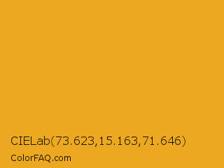 CIELab 73.623,15.163,71.646 Color is a normal orange color and the nearest color is Fuel Yellow #eca927. Hex code #eda821 and RGB value is rgb(237,168,33). In RGB color space, this color is composed of 93% red, 66% green, 13% blue, In CMYK color space, this color is composed of 0% cyan, 29% magenta, 86% yellow , 7% black , In HSL color space, this color has a hue angle of 40° , 85% saturation and 53% lightness.