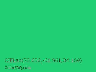 CIELab 73.656,-61.861,34.169 Color is a normal green color and the nearest color is UFO Green #3cd070. Hex code #20cf73 and RGB value is rgb(32,207,115). In RGB color space, this color is composed of 13% red, 81% green, 45% blue, In CMYK color space, this color is composed of 85% cyan, 0% magenta, 44% yellow , 19% black , In HSL color space, this color has a hue angle of 148° , 73% saturation and 47% lightness.