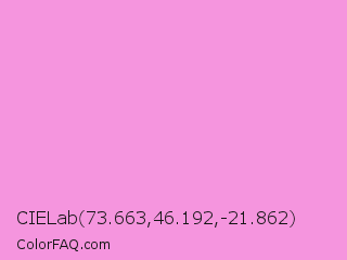 CIELab 73.663,46.192,-21.862 Color is a light magenta color and the nearest color is Lavender Rose #fba0e3. Hex code #f595de and RGB value is rgb(245,149,222). In RGB color space, this color is composed of 96% red, 58% green, 87% blue, In CMYK color space, this color is composed of 0% cyan, 39% magenta, 9% yellow , 4% black , In HSL color space, this color has a hue angle of 314° , 83% saturation and 77% lightness.