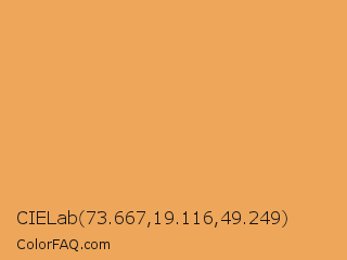CIELab 73.667,19.116,49.249 Color is a light orange color and the nearest color is Sandy Brown #f4a460. Hex code #eea65a and RGB value is rgb(238,166,90). In RGB color space, this color is composed of 93% red, 65% green, 35% blue, In CMYK color space, this color is composed of 0% cyan, 30% magenta, 62% yellow , 7% black , In HSL color space, this color has a hue angle of 31° , 81% saturation and 64% lightness.