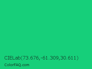 CIELab 73.676,-61.309,30.611 Color is a normal green color and the nearest color is Mountain Meadow Crayola #1ab385. Hex code #16cf7a and RGB value is rgb(22,207,122). In RGB color space, this color is composed of 9% red, 81% green, 48% blue, In CMYK color space, this color is composed of 89% cyan, 0% magenta, 41% yellow , 19% black , In HSL color space, this color has a hue angle of 152° , 81% saturation and 45% lightness.