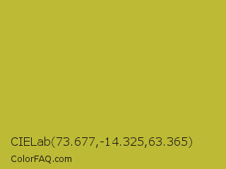 CIELab 73.677,-14.325,63.365 Color is a normal yellow color and the nearest color is Earls Green #c9b93b. Hex code #bdba36 and RGB value is rgb(189,186,54). In RGB color space, this color is composed of 74% red, 73% green, 21% blue, In CMYK color space, this color is composed of 0% cyan, 2% magenta, 71% yellow , 26% black , In HSL color space, this color has a hue angle of 59° , 56% saturation and 48% lightness.