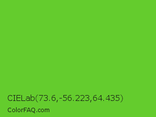 CIELab 73.6,-56.223,64.435 Color is a normal green color and the nearest color is Green RYB #66b032. Hex code #64cc2d and RGB value is rgb(100,204,45). In RGB color space, this color is composed of 39% red, 80% green, 18% blue, In CMYK color space, this color is composed of 51% cyan, 0% magenta, 78% yellow , 20% black , In HSL color space, this color has a hue angle of 99° , 64% saturation and 49% lightness.