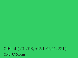 CIELab 73.703,-62.172,41.221 Color is a normal green color and the nearest color is UFO Green #3cd070. Hex code #32cf65 and RGB value is rgb(50,207,101). In RGB color space, this color is composed of 20% red, 81% green, 40% blue, In CMYK color space, this color is composed of 76% cyan, 0% magenta, 51% yellow , 19% black , In HSL color space, this color has a hue angle of 139° , 62% saturation and 50% lightness.