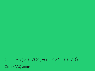 CIELab 73.704,-61.421,33.73 Color is a normal green color and the nearest color is UFO Green #3cd070. Hex code #23cf74 and RGB value is rgb(35,207,116). In RGB color space, this color is composed of 14% red, 81% green, 45% blue, In CMYK color space, this color is composed of 83% cyan, 0% magenta, 44% yellow , 19% black , In HSL color space, this color has a hue angle of 148° , 71% saturation and 47% lightness.