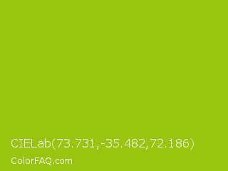 CIELab 73.731,-35.482,72.186 Color is a normal lime color and the nearest color is Pistachio Green #9dc209. Hex code #99c40f and RGB value is rgb(153,196,15). In RGB color space, this color is composed of 60% red, 77% green, 6% blue, In CMYK color space, this color is composed of 22% cyan, 0% magenta, 92% yellow , 23% black , In HSL color space, this color has a hue angle of 74° , 86% saturation and 41% lightness.