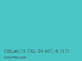 CIELab 73.732,-34.607,-8.717 Color is a normal cyan color and the nearest color is Sea Serpent #4bc7cf. Hex code #4ac7c4 and RGB value is rgb(74,199,196). In RGB color space, this color is composed of 29% red, 78% green, 77% blue, In CMYK color space, this color is composed of 63% cyan, 0% magenta, 2% yellow , 22% black , In HSL color space, this color has a hue angle of 179° , 53% saturation and 54% lightness.