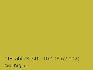 CIELab 73.741,-10.198,62.902 Color is a normal yellow color and the nearest color is Earls Green #c9b93b. Hex code #c4b838 and RGB value is rgb(196,184,56). In RGB color space, this color is composed of 77% red, 72% green, 22% blue, In CMYK color space, this color is composed of 0% cyan, 6% magenta, 71% yellow , 23% black , In HSL color space, this color has a hue angle of 55° , 56% saturation and 49% lightness.