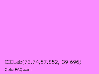 CIELab 73.74,57.852,-39.696 Color is a light magenta color and the nearest color is Light Fuchsia Pink #f984ef. Hex code #fa8cff and RGB value is rgb(250,140,255). In RGB color space, this color is composed of 98% red, 55% green, 100% blue, In CMYK color space, this color is composed of 2% cyan, 45% magenta, 0% yellow , 0% black , In HSL color space, this color has a hue angle of 297° , 100% saturation and 77% lightness.