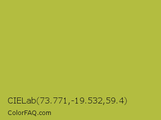 CIELab 73.771,-19.532,59.4 Color is a normal yellow color and the nearest color is Android Green #a4c639. Hex code #b3bd40 and RGB value is rgb(179,189,64). In RGB color space, this color is composed of 70% red, 74% green, 25% blue, In CMYK color space, this color is composed of 5% cyan, 0% magenta, 66% yellow , 26% black , In HSL color space, this color has a hue angle of 65° , 49% saturation and 50% lightness.