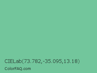 CIELab 73.782,-35.095,13.18 Color is a light green color and the nearest color is De York #7ac488. Hex code #72c69c and RGB value is rgb(114,198,156). In RGB color space, this color is composed of 45% red, 78% green, 61% blue, In CMYK color space, this color is composed of 42% cyan, 0% magenta, 21% yellow , 22% black , In HSL color space, this color has a hue angle of 150° , 42% saturation and 61% lightness.