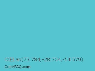 CIELab 73.784,-28.704,-14.579 Color is a normal cyan color and the nearest color is Sea Serpent #4bc7cf. Hex code #55c5cf and RGB value is rgb(85,197,207). In RGB color space, this color is composed of 33% red, 77% green, 81% blue, In CMYK color space, this color is composed of 59% cyan, 5% magenta, 0% yellow , 19% black , In HSL color space, this color has a hue angle of 185° , 56% saturation and 57% lightness.