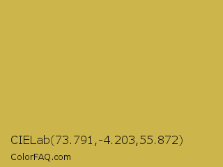 CIELab 73.791,-4.203,55.872 Color is a normal yellow color and the nearest color is Turmeric #cabb48. Hex code #ccb54a and RGB value is rgb(204,181,74). In RGB color space, this color is composed of 80% red, 71% green, 29% blue, In CMYK color space, this color is composed of 0% cyan, 11% magenta, 64% yellow , 20% black , In HSL color space, this color has a hue angle of 49° , 56% saturation and 55% lightness.
