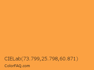 CIELab 73.799,25.798,60.871 Color is a light orange color and the nearest color is Neon Carrot #ffa343. Hex code #fba142 and RGB value is rgb(251,161,66). In RGB color space, this color is composed of 98% red, 63% green, 26% blue, In CMYK color space, this color is composed of 0% cyan, 36% magenta, 74% yellow , 2% black , In HSL color space, this color has a hue angle of 31° , 96% saturation and 62% lightness.