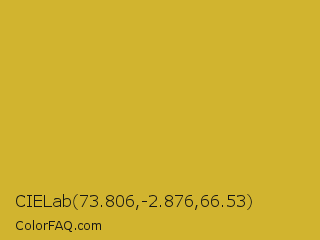 CIELab 73.806,-2.876,66.53 Color is a normal yellow color and the nearest color is Gold Metallic #d4af37. Hex code #d1b42f and RGB value is rgb(209,180,47). In RGB color space, this color is composed of 82% red, 71% green, 18% blue, In CMYK color space, this color is composed of 0% cyan, 14% magenta, 78% yellow , 18% black , In HSL color space, this color has a hue angle of 49° , 64% saturation and 50% lightness.