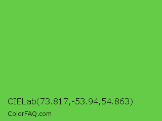 CIELab 73.817,-53.94,54.863 Color is a normal green color and the nearest color is Mantis #74c365. Hex code #65cc48 and RGB value is rgb(101,204,72). In RGB color space, this color is composed of 40% red, 80% green, 28% blue, In CMYK color space, this color is composed of 50% cyan, 0% magenta, 65% yellow , 20% black , In HSL color space, this color has a hue angle of 107° , 56% saturation and 54% lightness.