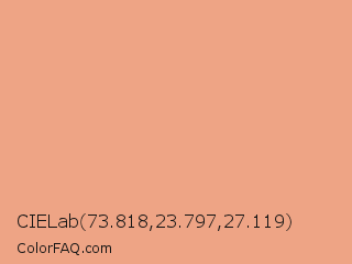 CIELab 73.818,23.797,27.119 Color is a light orange color and the nearest color is Tonys Pink #e79f8c. Hex code #eea485 and RGB value is rgb(238,164,133). In RGB color space, this color is composed of 93% red, 64% green, 52% blue, In CMYK color space, this color is composed of 0% cyan, 31% magenta, 44% yellow , 7% black , In HSL color space, this color has a hue angle of 18° , 76% saturation and 73% lightness.