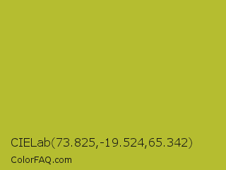 CIELab 73.825,-19.524,65.342 Color is a normal yellow color and the nearest color is Android Green #a4c639. Hex code #b5bd30 and RGB value is rgb(181,189,48). In RGB color space, this color is composed of 71% red, 74% green, 19% blue, In CMYK color space, this color is composed of 4% cyan, 0% magenta, 75% yellow , 26% black , In HSL color space, this color has a hue angle of 63° , 59% saturation and 46% lightness.