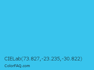CIELab 73.827,-23.235,-30.822 Color is a normal blue color and the nearest color is Picton Blue #45b1e8. Hex code #38c4ed and RGB value is rgb(56,196,237). In RGB color space, this color is composed of 22% red, 77% green, 93% blue, In CMYK color space, this color is composed of 76% cyan, 17% magenta, 0% yellow , 7% black , In HSL color space, this color has a hue angle of 194° , 83% saturation and 57% lightness.