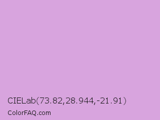 CIELab 73.82,28.944,-21.91 Color is a light magenta color and the nearest color is Medium Lavender Magenta #dda0dd. Hex code #d8a4de and RGB value is rgb(216,164,222). In RGB color space, this color is composed of 85% red, 64% green, 87% blue, In CMYK color space, this color is composed of 3% cyan, 26% magenta, 0% yellow , 13% black , In HSL color space, this color has a hue angle of 294° , 47% saturation and 76% lightness.