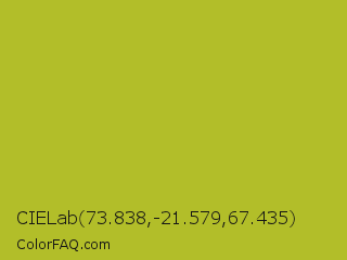 CIELab 73.838,-21.579,67.435 Color is a normal yellow color and the nearest color is Acid Green #b0bf1a. Hex code #b2be29 and RGB value is rgb(178,190,41). In RGB color space, this color is composed of 70% red, 75% green, 16% blue, In CMYK color space, this color is composed of 6% cyan, 0% magenta, 78% yellow , 25% black , In HSL color space, this color has a hue angle of 65° , 65% saturation and 45% lightness.