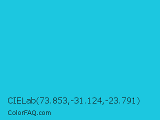 CIELab 73.853,-31.124,-23.791 Color is a normal cyan color and the nearest color is Scooter #2ebfd4. Hex code #1cc7e0 and RGB value is rgb(28,199,224). In RGB color space, this color is composed of 11% red, 78% green, 88% blue, In CMYK color space, this color is composed of 88% cyan, 11% magenta, 0% yellow , 12% black , In HSL color space, this color has a hue angle of 188° , 78% saturation and 49% lightness.