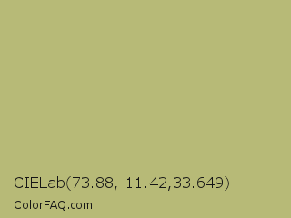 CIELab 73.88,-11.42,33.649 Color is a normal yellow color and the nearest color is Misty Moss #bbb477. Hex code #b7ba77 and RGB value is rgb(183,186,119). In RGB color space, this color is composed of 72% red, 73% green, 47% blue, In CMYK color space, this color is composed of 2% cyan, 0% magenta, 36% yellow , 27% black , In HSL color space, this color has a hue angle of 63° , 33% saturation and 60% lightness.