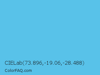 CIELab 73.896,-19.06,-28.488 Color is a light blue color and the nearest color is Viking #64ccdb. Hex code #58c2e9 and RGB value is rgb(88,194,233). In RGB color space, this color is composed of 35% red, 76% green, 91% blue, In CMYK color space, this color is composed of 62% cyan, 17% magenta, 0% yellow , 9% black , In HSL color space, this color has a hue angle of 196° , 77% saturation and 63% lightness.