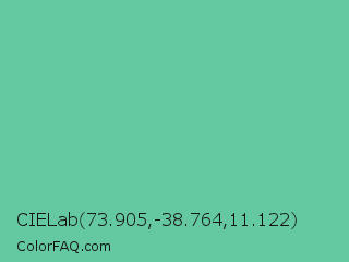 CIELab 73.905,-38.764,11.122 Color is a normal green color and the nearest color is Medium Aquamarine #66ddaa. Hex code #64c8a0 and RGB value is rgb(100,200,160). In RGB color space, this color is composed of 39% red, 78% green, 63% blue, In CMYK color space, this color is composed of 50% cyan, 0% magenta, 20% yellow , 22% black , In HSL color space, this color has a hue angle of 156° , 48% saturation and 59% lightness.