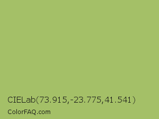 CIELab 73.915,-23.775,41.541 Color is a normal lime color and the nearest color is Middle Green Yellow #acbf60. Hex code #a4c067 and RGB value is rgb(164,192,103). In RGB color space, this color is composed of 64% red, 75% green, 40% blue, In CMYK color space, this color is composed of 15% cyan, 0% magenta, 46% yellow , 25% black , In HSL color space, this color has a hue angle of 79° , 41% saturation and 58% lightness.
