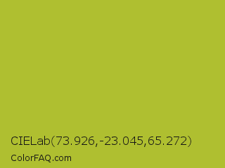 CIELab 73.926,-23.045,65.272 Color is a normal yellow color and the nearest color is Android Green #a4c639. Hex code #afbf30 and RGB value is rgb(175,191,48). In RGB color space, this color is composed of 69% red, 75% green, 19% blue, In CMYK color space, this color is composed of 8% cyan, 0% magenta, 75% yellow , 25% black , In HSL color space, this color has a hue angle of 67° , 60% saturation and 47% lightness.