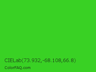 CIELab 73.932,-68.108,66.8 Color is a normal green color and the nearest color is Lime Green #32cd32. Hex code #39d124 and RGB value is rgb(57,209,36). In RGB color space, this color is composed of 22% red, 82% green, 14% blue, In CMYK color space, this color is composed of 73% cyan, 0% magenta, 83% yellow , 18% black , In HSL color space, this color has a hue angle of 113° , 71% saturation and 48% lightness.